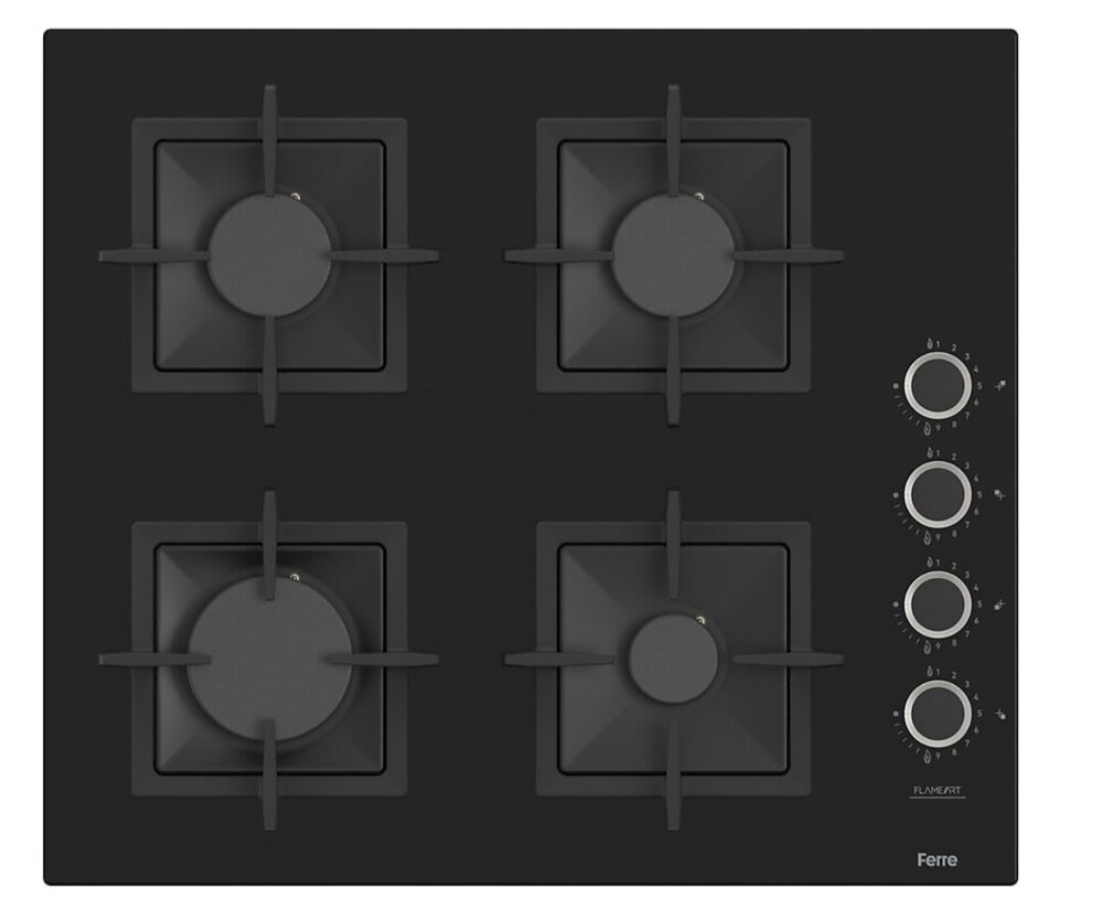 Meta Description: Ferre SC205 Flameart siyah cam ankastre gazlı ocak. 60 cm genişlik, 4 gözlü yapı, düğmeli kontrol paneli ve modern Flameart tasarımı ile güçlü pişirme deneyimi.